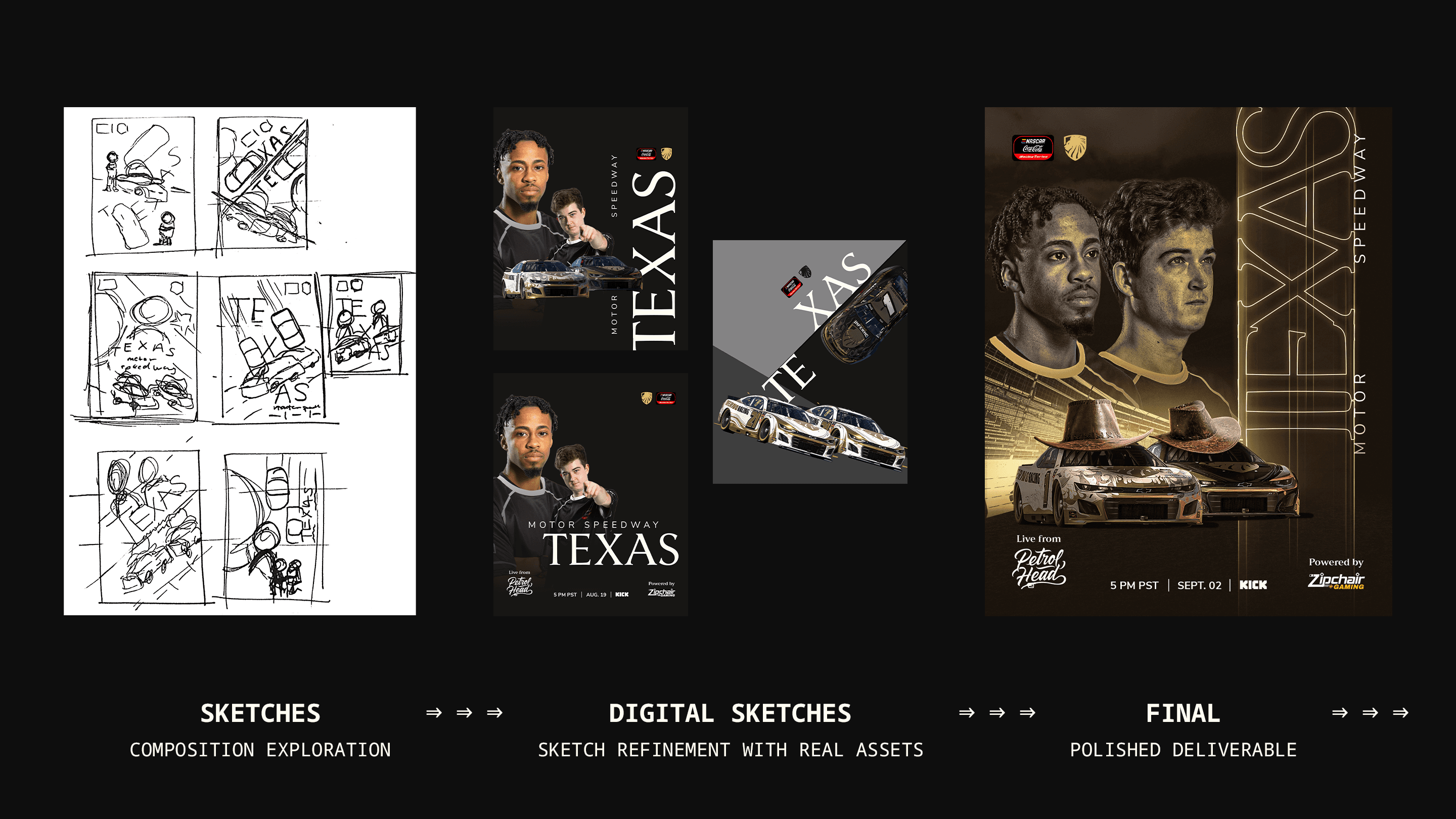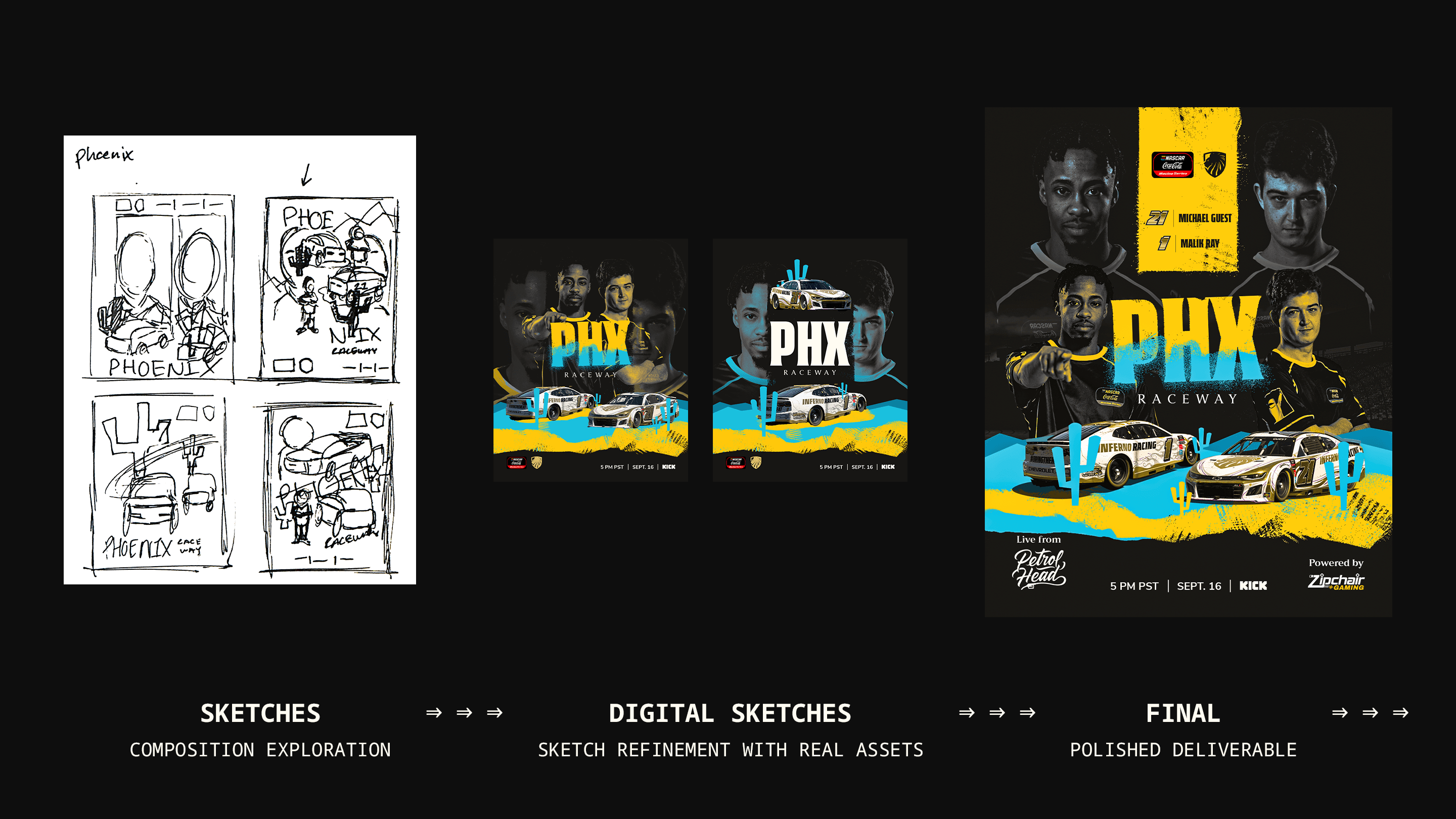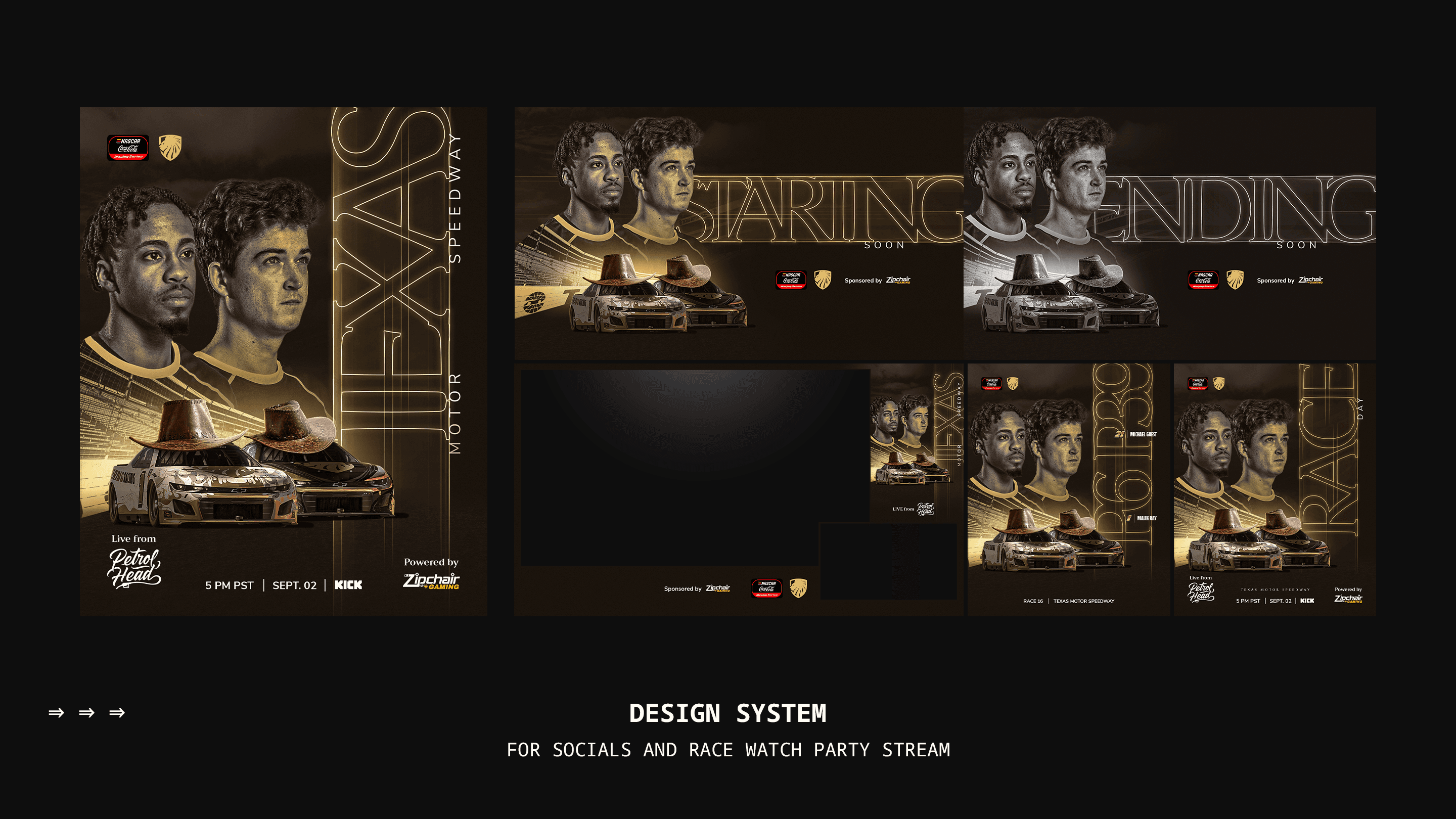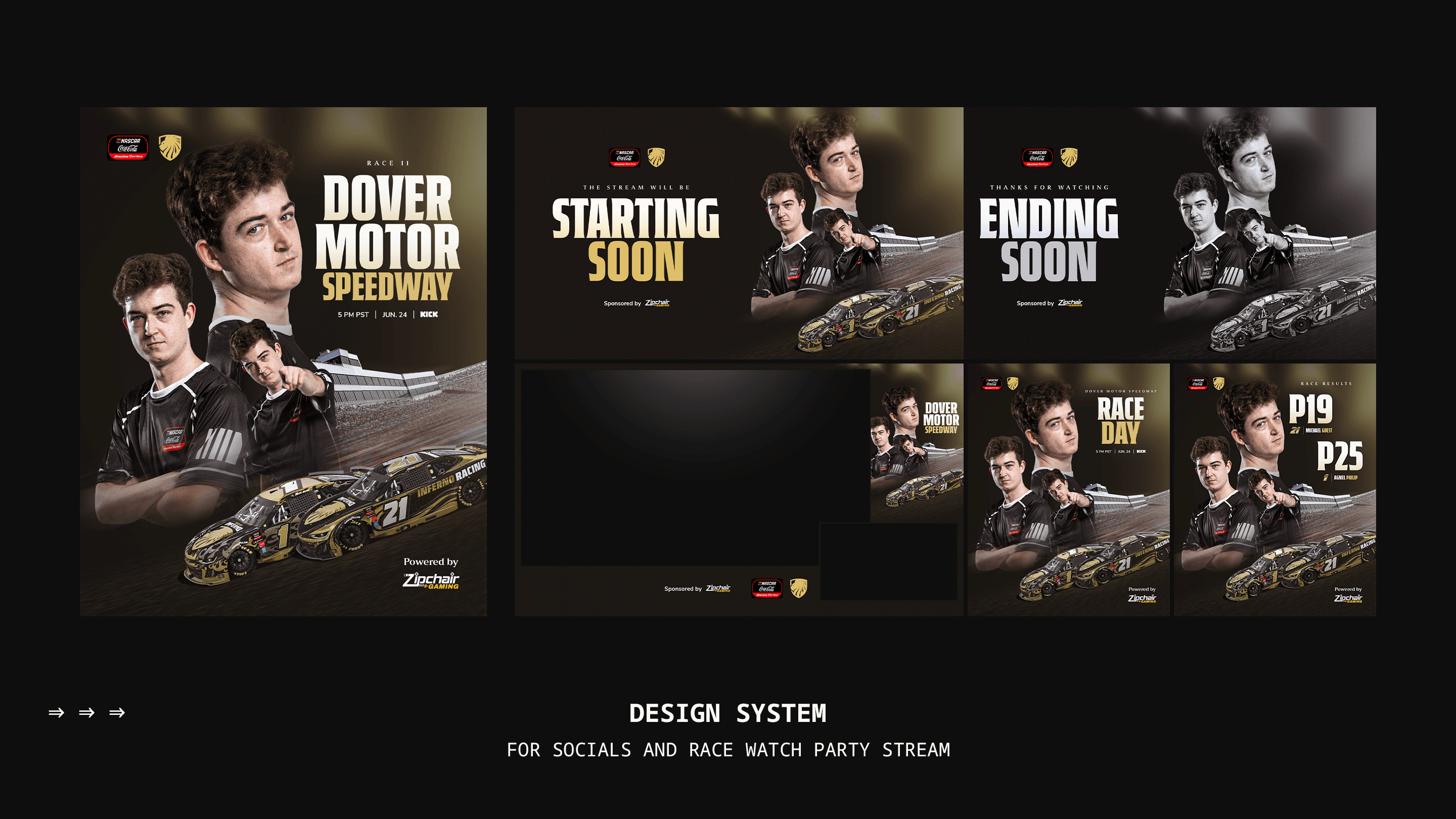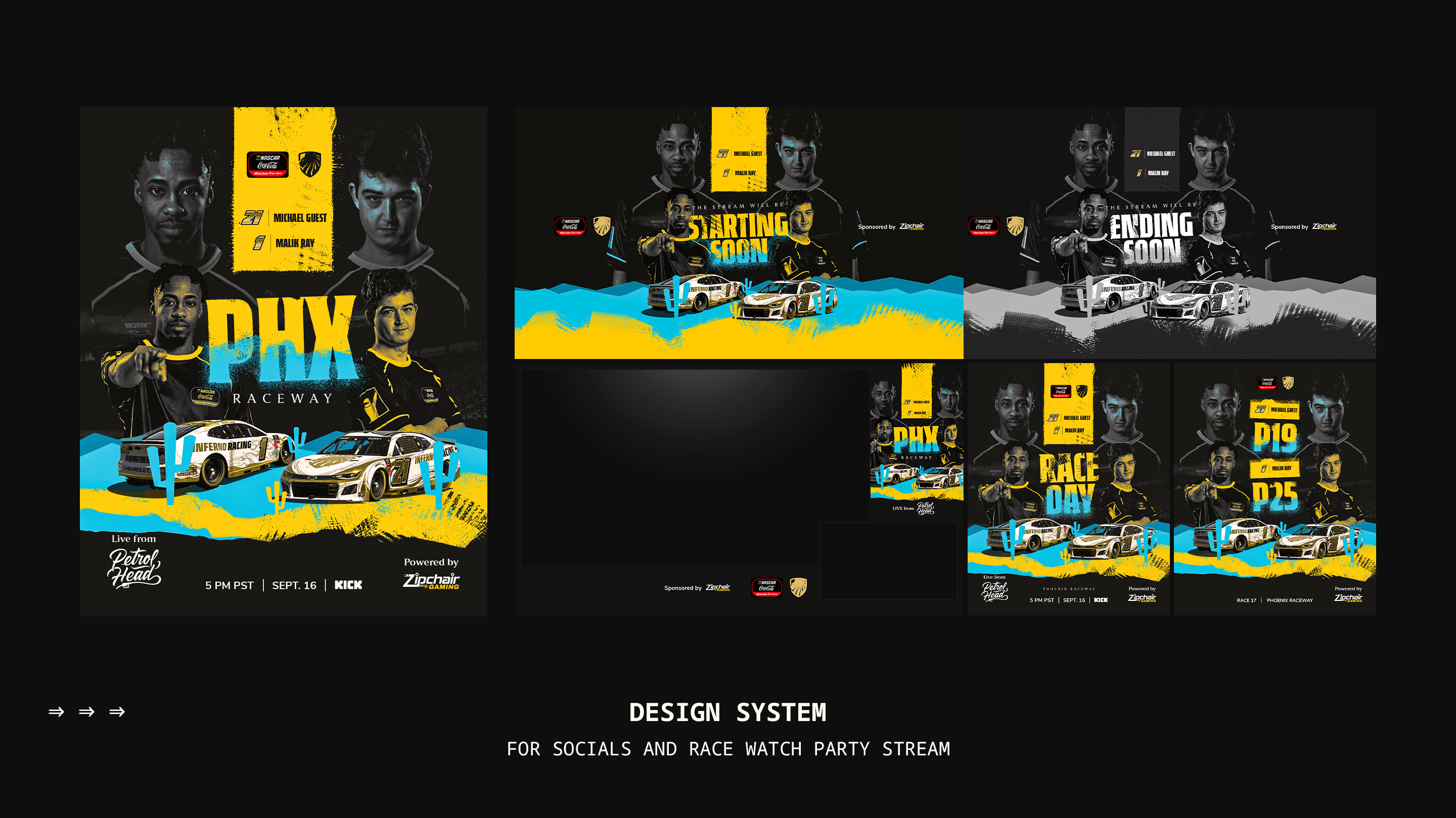 Alongside a set of core graphics, each design was transformed into a system of assets for social media and live streaming platforms. These assets include race-day promotion, placement results, stream overlays and screens.