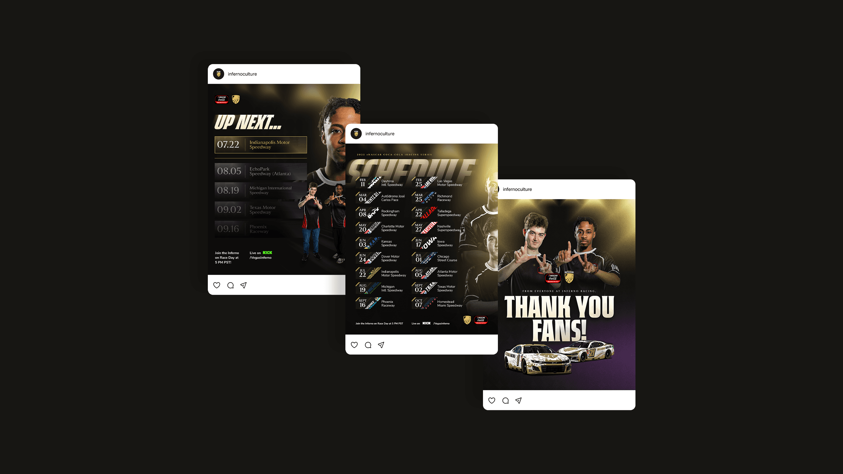 For 18 bi-weekly races, a design was developed to reflect the track, city, or occasion of the race. This unique approach allowed Inferno's campaign to stand out amongst other teams, generating over one-hundred thousand views across Instagram and X (formerly Twitter), and thousands of post engagements.